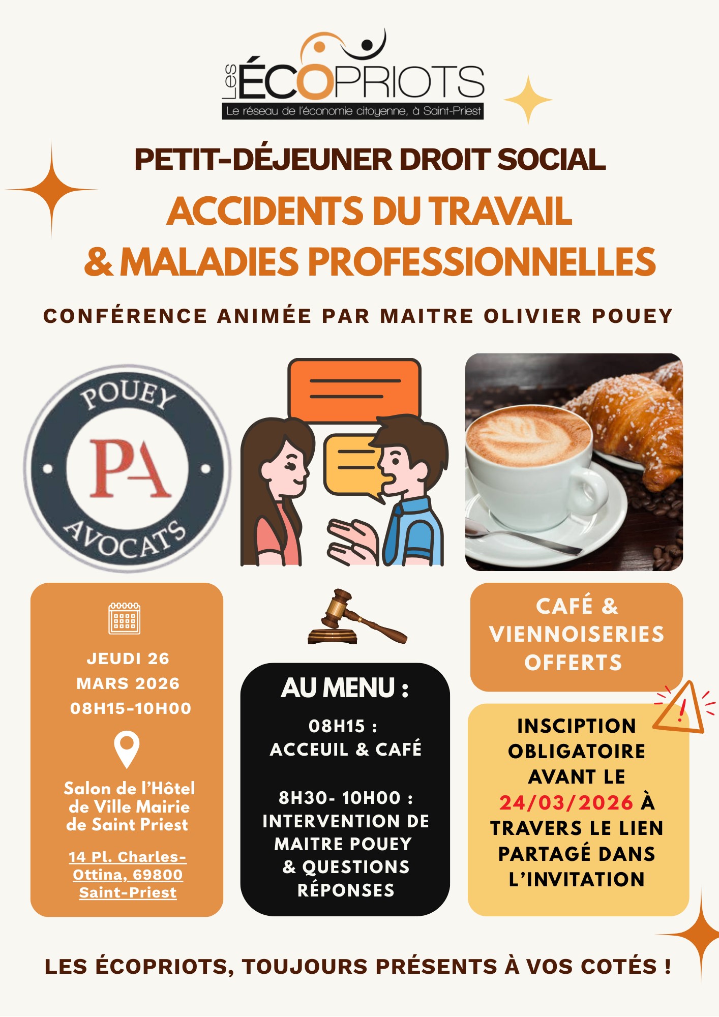Très belle matinale autour d’un petit déjeuner en mairie de St Priest initié par les Ecopriots pour accueillir en conférence Maître Olivier POUEY sur un sujet d’actualité qu’est l’accidentologie et la maladie en milieu professionnel.